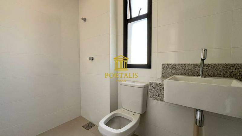 Banheiros (social e suíte) com acabamento premium em porcelanato e bancadas em granito.