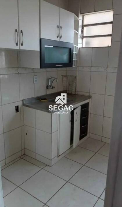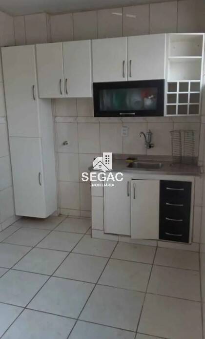 Apartamento com dois quartos, sala de jantar, banheiro, cozinha com armários.